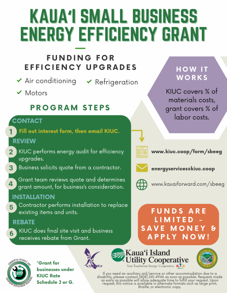 In partnership with the Kauaʻi Economic Development Board and the Kauaʻi Island Utility Cooperative, the County of Kauaʻi Office of Economic Development is excited to announce the launch of the Kauaʻi Small Business Energy Efficiency Grant (SBEEG).
