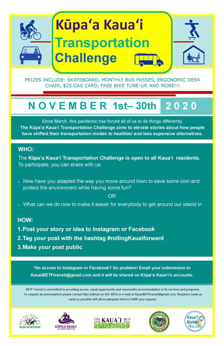 Create a social media post (can be a video or written) describing your transportation solution and include the hashtag #rollingkauaiforward. Win great prizes, live healthier, save $, and get where you need to go!